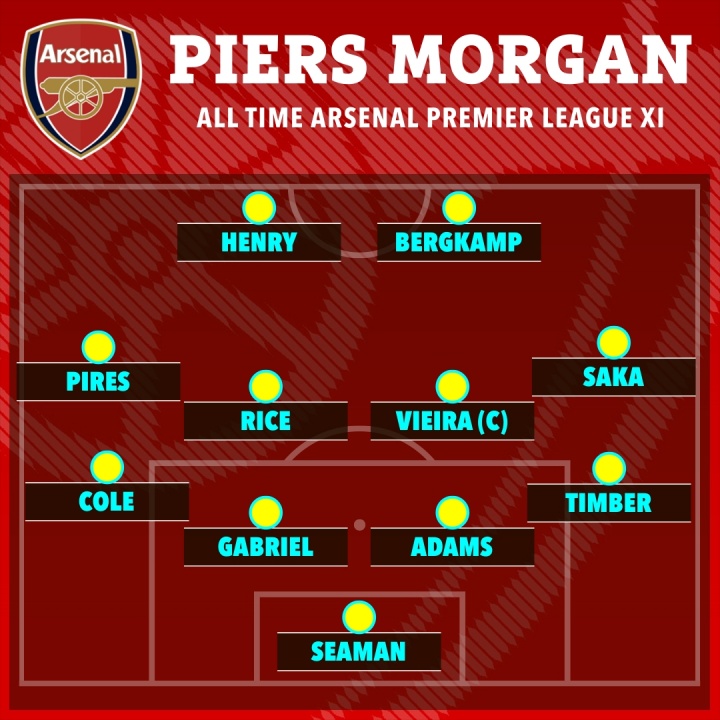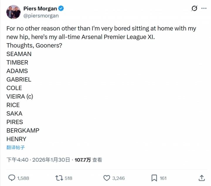 01月30日讯 名嘴皮尔斯·摩根今日发布社媒,作为知名枪迷的他评选出了阿森纳历史最佳11人,有萨卡等四名现役球员入选。具体名单如图。