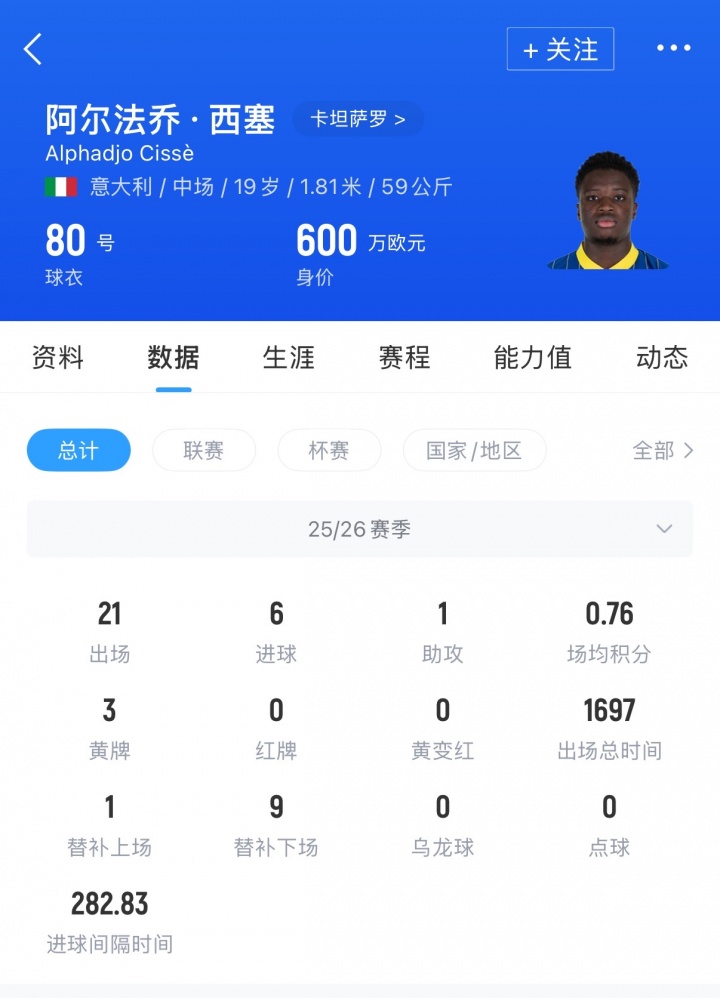 阿尔法乔·西塞,现年19岁。球员本赛季被维罗纳外租至意乙卡坦萨罗,本赛季至今球员出场21次,贡献6球1助。目前西塞德转身价为600万欧元。