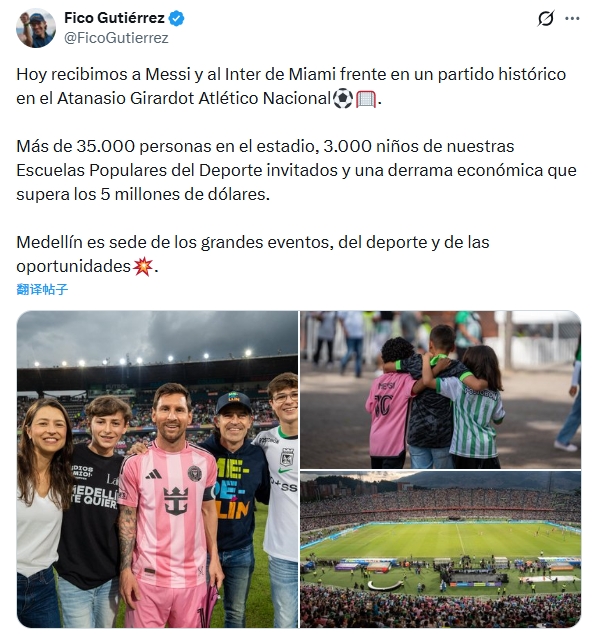 麦德林市长Fico Gutiérrez在个人社媒晒出与梅西合影照片同时写道:“今天,梅西和迈阿密国际在吉拉多特球场与麦德林国民竞技进行一场历史性的比赛。