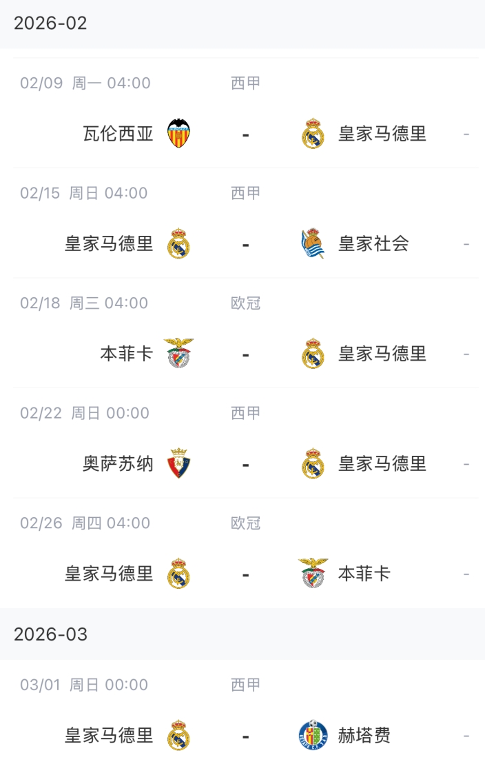 接下来一个月,皇马有两场对本菲卡的欧冠淘汰赛附加赛,另外还有4场联赛。