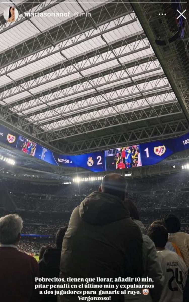 帕拉松的妻子玛尔塔·索里亚诺在自己的社交媒体上嘲讽皇马:“可怜的家伙,他们必须依靠哭泣、10分钟补时、在最后1分钟获得点球、并且罚下我们的两名球员,这样他们才能战胜巴列卡诺。真是可耻!”她还配上了一个小丑的图标。