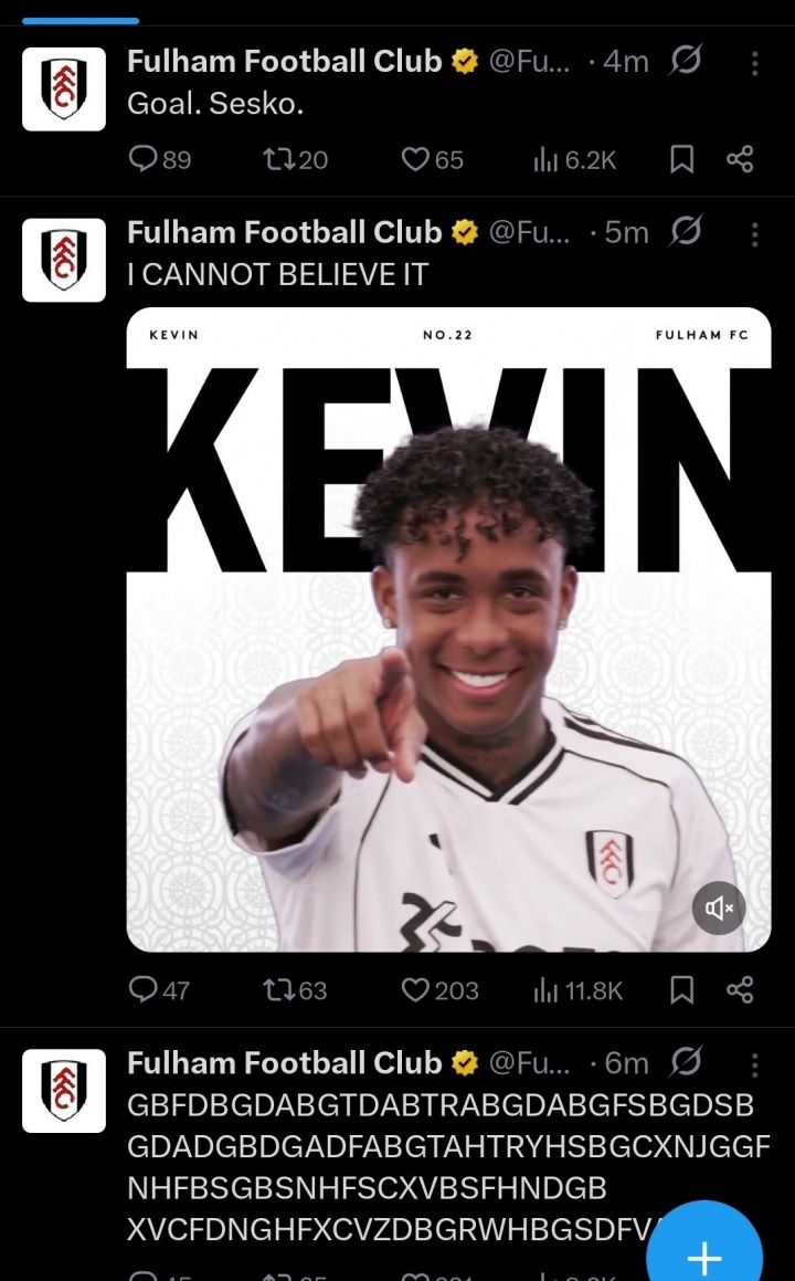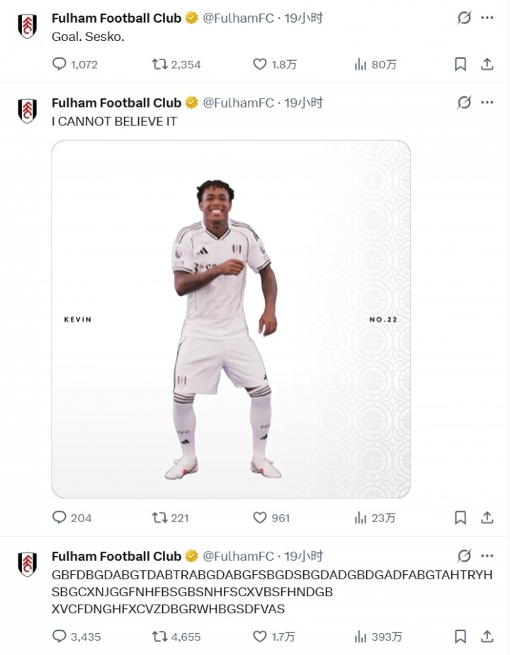 当凯文在第91分钟依靠一记世界波为富勒姆在梦剧场扳平比分时,富勒姆官推陷入狂欢,并发布了一大段的乱码。在凯文的进球赛讯中,官推写道:“我简直不敢相信”。