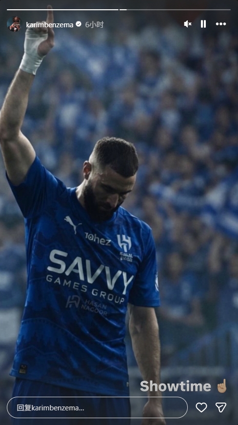 官宣后,本泽马更新社媒,晒出自己身穿新月球衣单手指天的图,配文“showtime(表演时间)☝️”。
