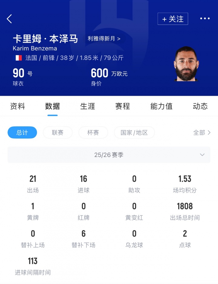 本赛季,本泽马各赛事21场打进16球,其中沙特联14场8球,亚冠精英联赛4场4球。本泽马此前在吉达联合罢赛2场,下轮沙特联可能迎来复出,随利雅得新月客战阿科多。
