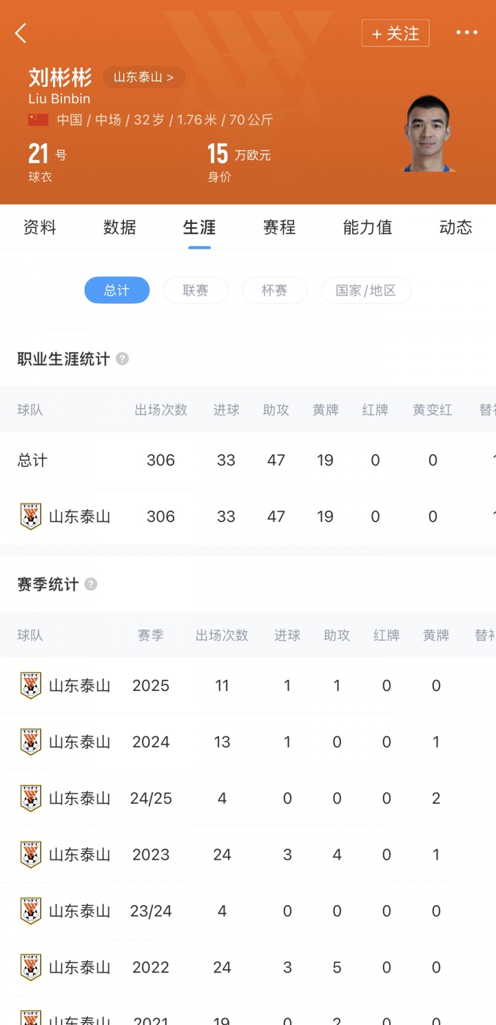 刘彬彬整个职业生涯都效力于山东泰山,自2012年至今,14个赛季共为球队出场306次。