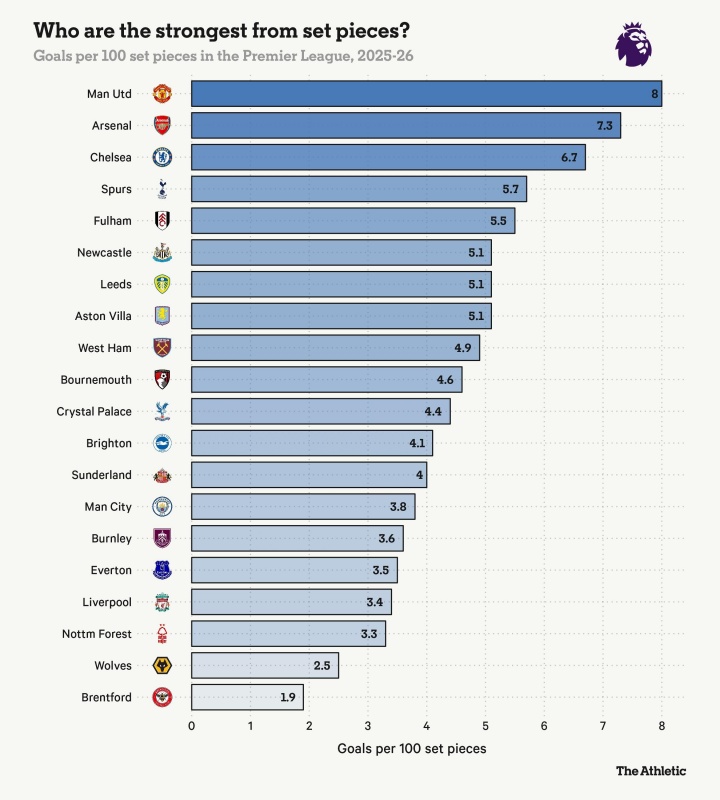 02月03日讯 据TA报道,本赛季至今,曼联是英超定位球效率最高的球队,每100次定位球机会就能打入8球,高于阿森纳的7.3球。