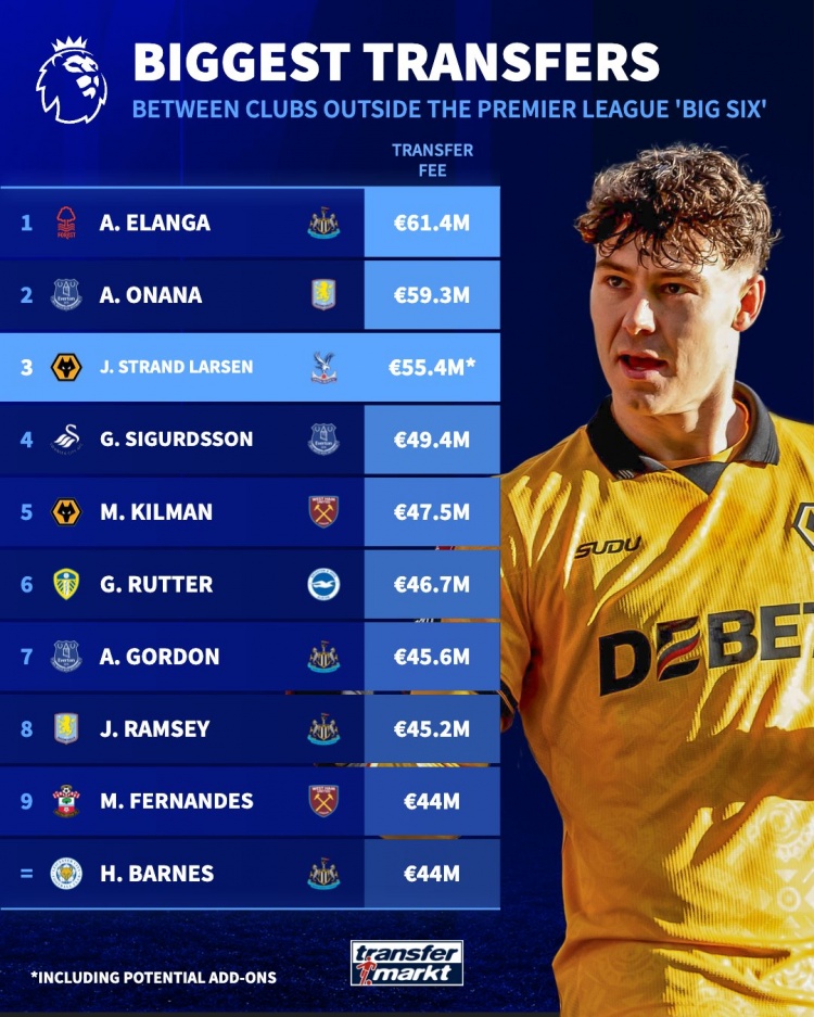 2月4日讯 英超传统BIG6在转会市场上能够花费大量资金进行引援,非BIG6球队的转会运作经常是量入为出,但他们也偶尔会豪掷资金引进心仪的球员。德国转会市场盘点了英超非BIG6引援身价排行情况,伊兰加以6140万欧元居首,水晶宫新援拉尔森有望成为历史第三(含浮动费用)。