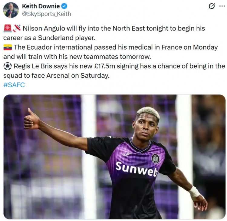 报道称这位厄瓜多尔国脚周一在法国通过了体检,并将于明天与新队友一起训练。主教练雷吉斯·勒布里斯表示,这位球队1750万英镑引进的新援有可能在周六对阵阿森纳的比赛中进入大名单。