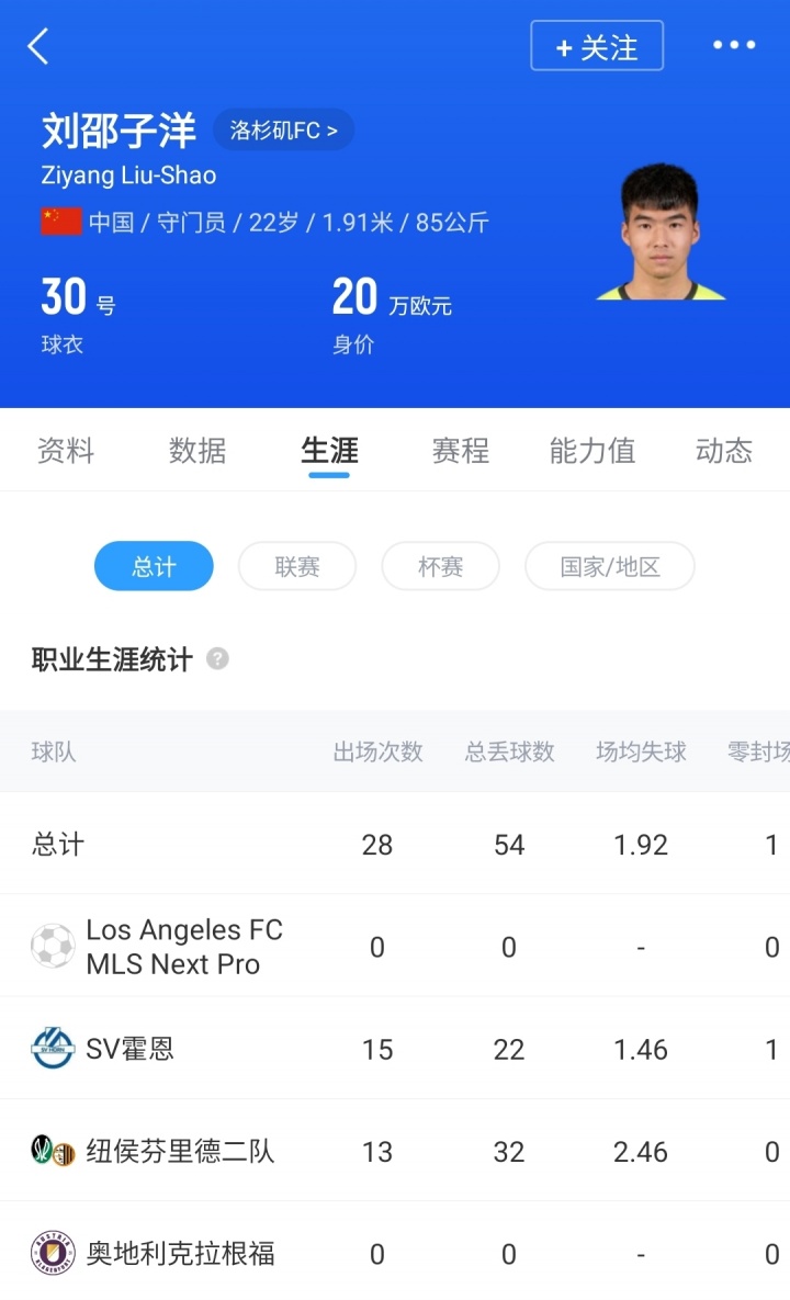 上赛季刘邵子洋效力的奥地利乙级球队SV霍恩遭遇降级,他代表球队出场15次,实现1次零封。