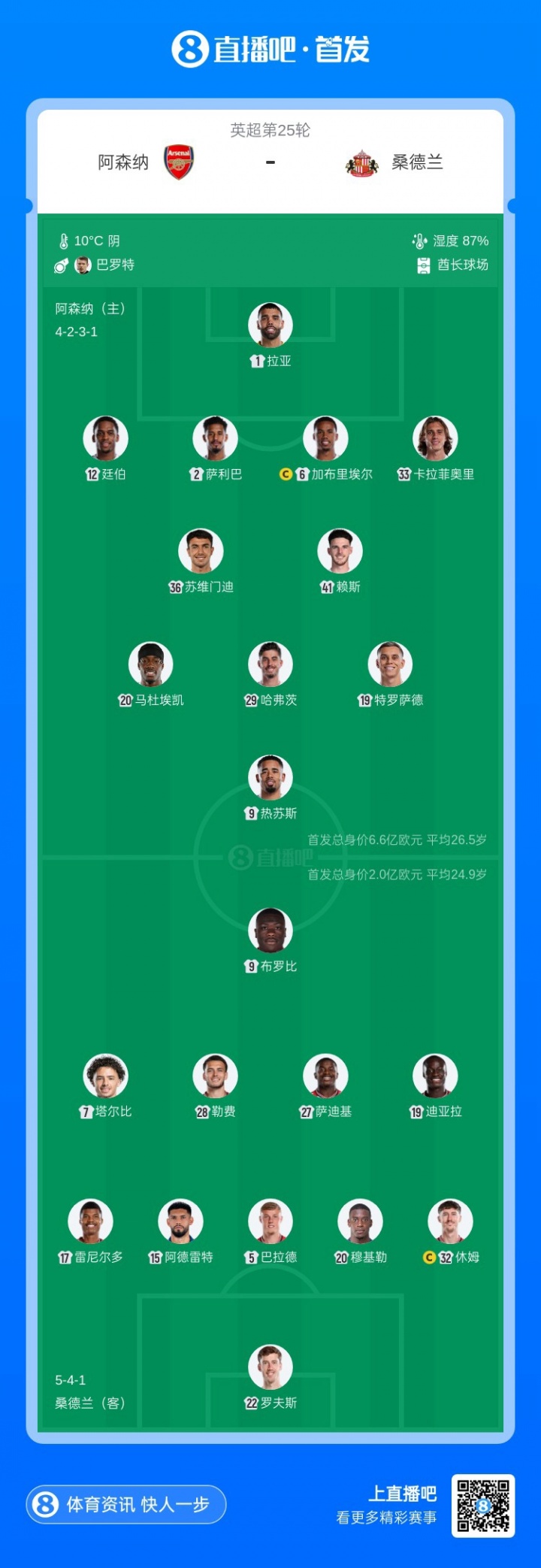 阿森纳首发:1-拉亚、12-廷伯、2-萨利巴、6-加布里埃尔、33-卡拉菲奥里、36-苏维门迪、41-赖斯、29-哈弗茨、19-特罗萨德、20-马杜埃凯、9-热苏斯