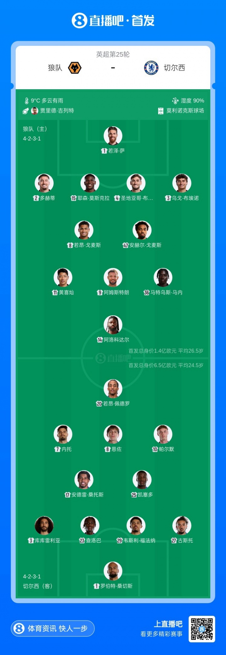 狼队首发:1-若泽·萨、2-多赫蒂、3-乌戈·布埃诺、4-圣地亚哥·布埃诺、15-耶森·莫斯克拉、8-若昂·戈麦斯、47-A·戈麦斯、9-阿姆斯特朗、11-黄喜灿、14-阿洛科达尔、36-马特乌斯·马内