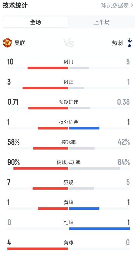 曼联半场1-0热刺数据:射门10-5,射正3-1,控球58%-42%,红牌0-1