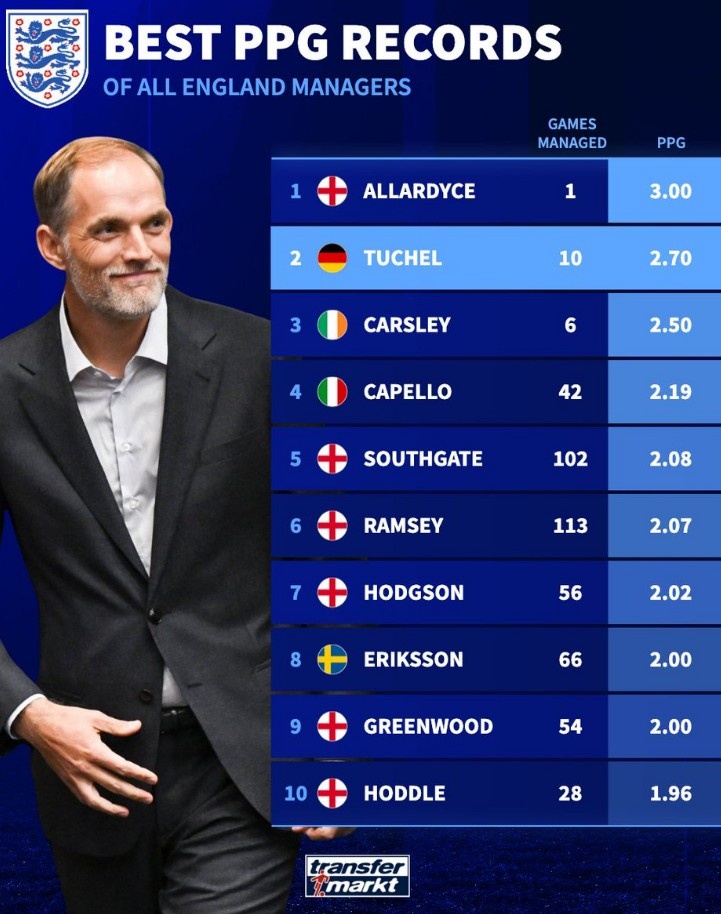 2月12日讯 图赫尔正式与英格兰队续约至2028年,德转也盘点了英格兰队史场均积分最高主帅榜单,具体如下: