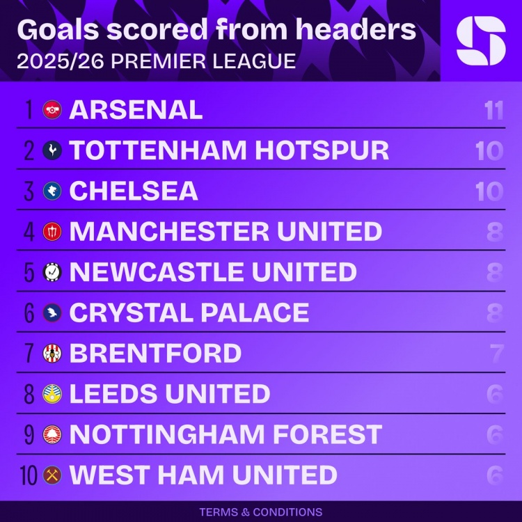 2月13日讯 Squawka统计了本赛季各队在英超比赛中的头球进球数量,并列出榜单,阿森纳11球最多,热刺、切尔西10球次席。
