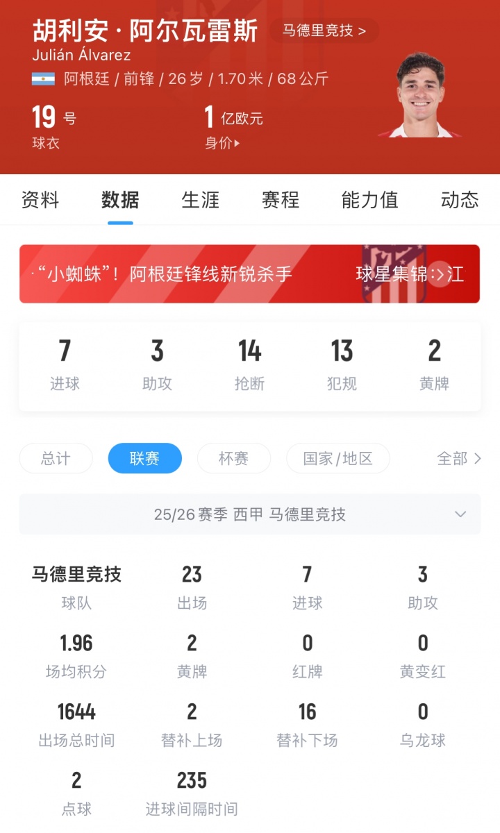 阿尔瓦雷斯现年26岁,身价高达1亿欧,他与马竞的合同2030年到期。据此前多家媒体报道,他在今夏将成为多家豪门争抢的对象,其中包括阿森纳、切尔西、巴萨等队,据悉马竞要价超9500万欧。