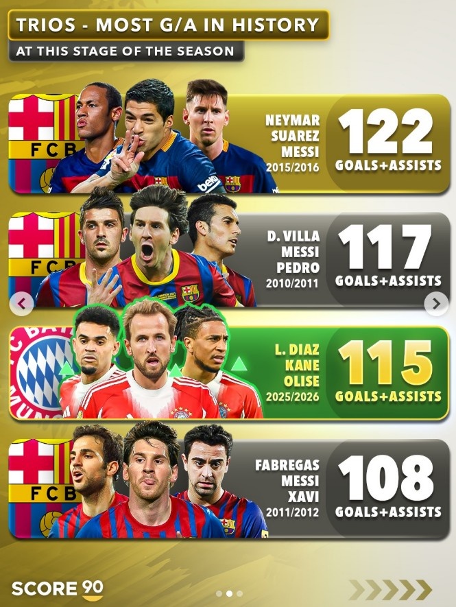 2月13日讯 本赛季截至目前拜仁三叉戟凯恩、奥利塞以及迪亚斯共计直接参与115球(进球+助攻),在足坛历史三叉戟同期数据能够位列第三位,具体榜单如下: