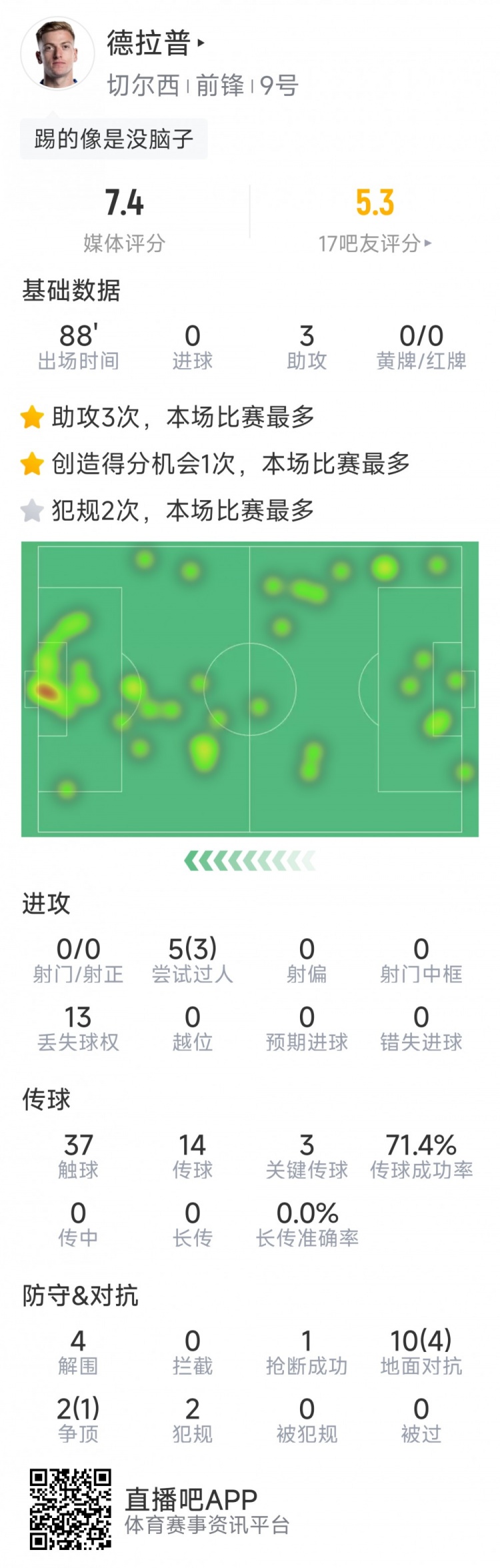 2月14日讯 在本轮足总杯,切尔西4-0击败赫尔城,德拉普助攻戴帽,以下为他在本场数据: