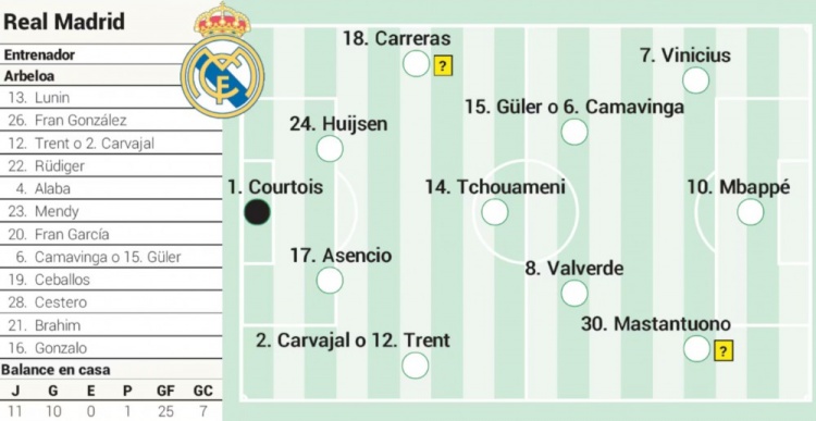 上轮停赛的维尼修斯此役回归先发,前场三人还有姆巴佩以及马斯坦托诺。右后卫位置卡瓦哈尔和阿诺德都可能在此役首发出战,中场居莱尔以及卡马文加将争夺一个先发位置。