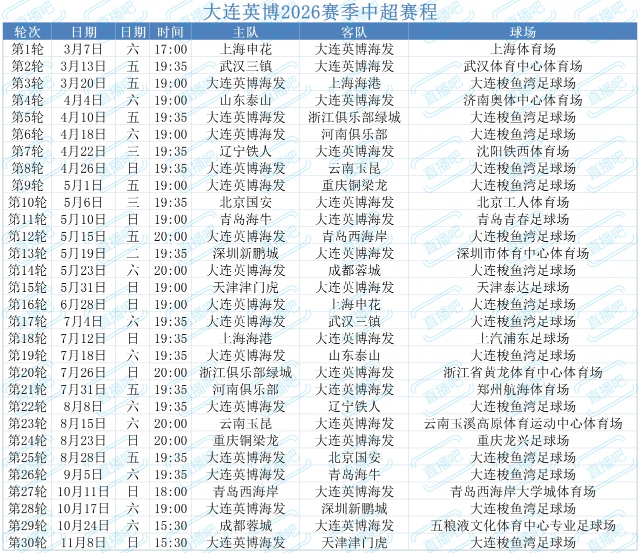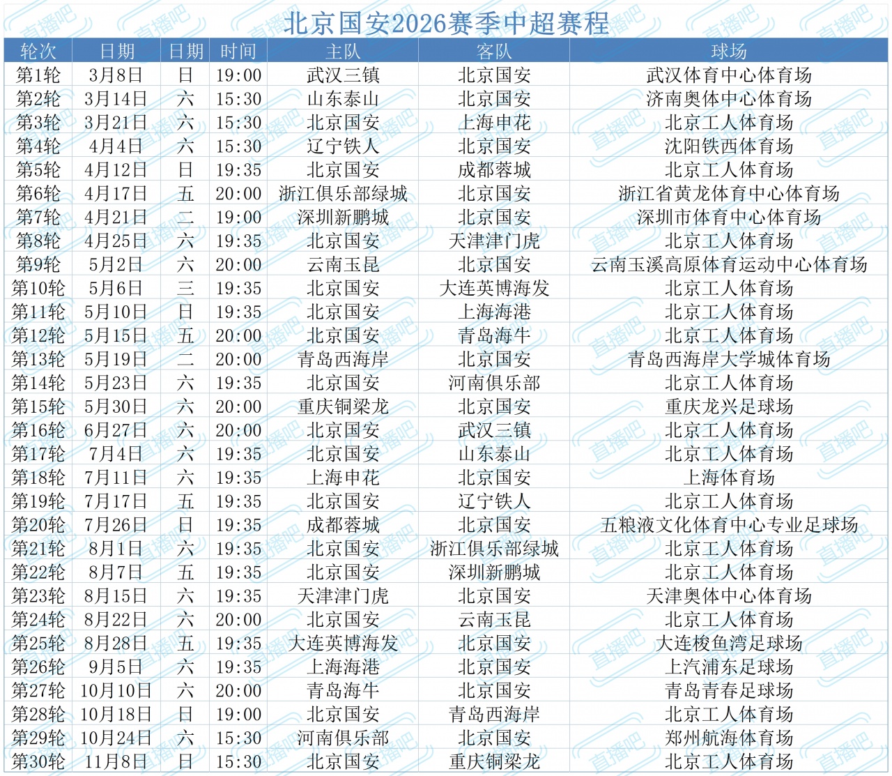 一目了然!2026赛季中超16队完整30轮赛程,铁杆球迷快收藏转发!