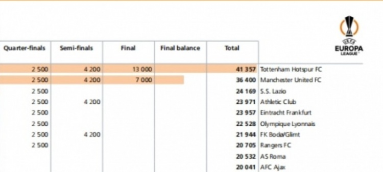 上赛季欧联奖金公布:冠军热刺4135.7万欧居首,曼联3640万列次席