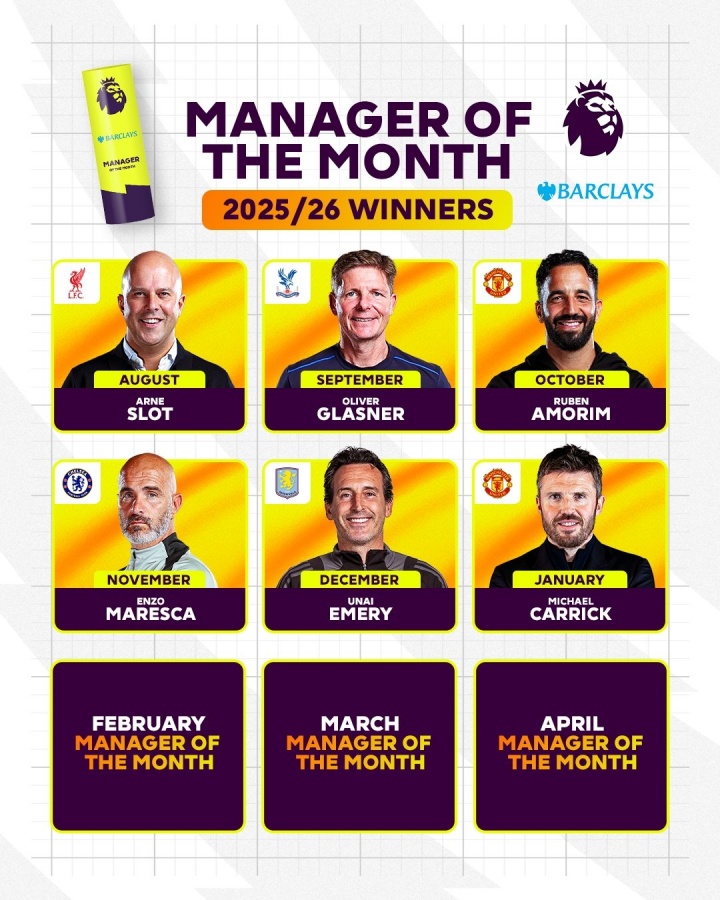 值得一提的是,上述六人中,阿莫林和马雷斯卡已经各自下课。而本赛季英超还将诞生三位月最佳教练得主,你认为会是谁?