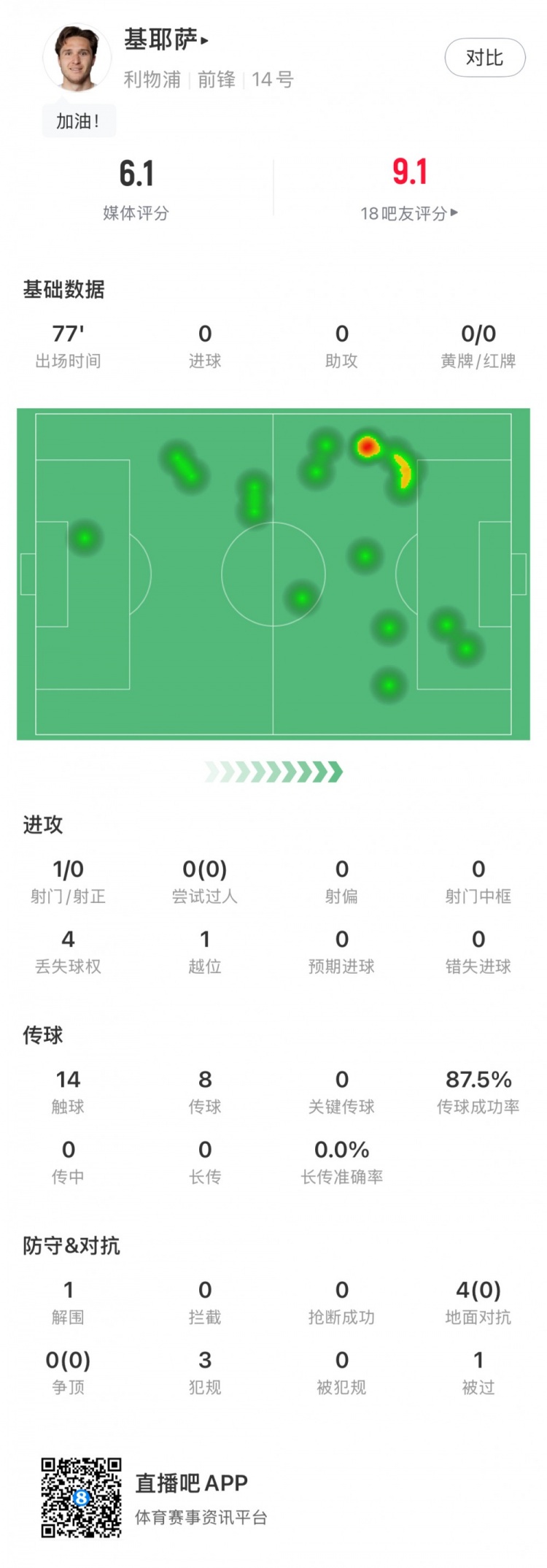 2月15日讯 足总杯第4轮,利物浦vs布莱顿,基耶萨首发出战77分钟,1射0正,获评6.1分。