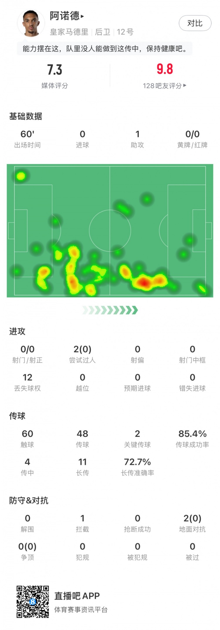 2月15日讯 西甲第24轮,皇马主场对阵皇家社会,阿诺德首发出战60分钟,贡献1次助攻,获评7.3分。