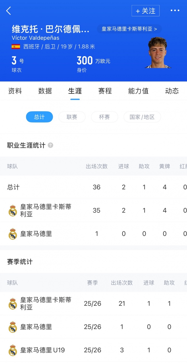 02月15日讯 据西媒《阿斯报》报道,多家球队都在关注皇马19岁后卫巴尔德佩尼亚斯,球员目前合同解约金条款在5000万欧元以上。