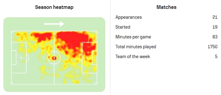 对阵霍芬海姆的比赛只是迪亚斯极致效率淋漓尽致的一次展现:单场5次射门4次射正,10次过人7次成功,传球成功率高达94.7%,而帽子戏法加两造点也让其单场参与进球数追平拜仁队史边锋纪录。而将时间线拉至整个2025-26赛季,迪亚斯数据升级后的效率会更加明显。
