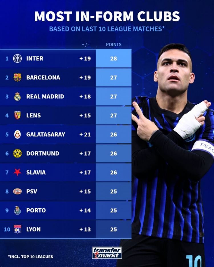 前10联赛近10轮拿分榜:国米28分居首,巴萨、皇马、朗斯27分