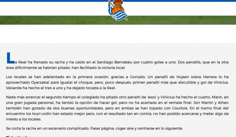 皇家社会被迫中止了良好的势头,在伯纳乌球场以1-4的比分落败。两个点球为这场失利埋下了伏笔,如果同样的动作发生在另一方的禁区内,恐怕很难被判罚。
