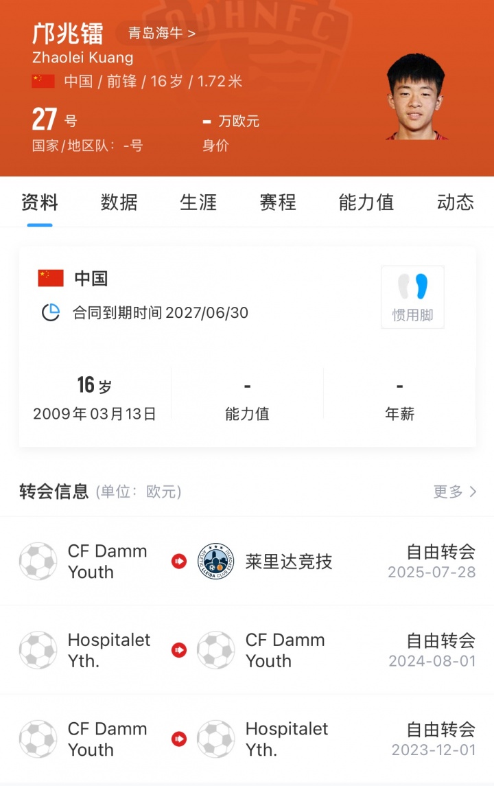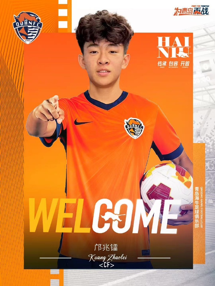 邝兆镭:2009年出生,司职前锋,虽然年纪尚小,但邝兆镭在2023年便前往西班牙CF达姆青年队进行历练,先后效力奥斯皮塔莱特青年队及莱里达竞技。邝兆镭多次入选国少队,为国出战。邝兆镭是中国足坛极具潜力的年轻球员之一,期待他能够快速融入球队,适应中超节奏,在中超平台取得充足的成长,给予球队最大帮助,期待新赛季一起为青岛而战。