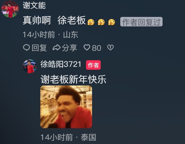 谢文能在评论里回复:“真帅啊 ,徐老板。”另外,戴伟浚、彭鹏等人也留言为徐皓阳送上新年祝福。