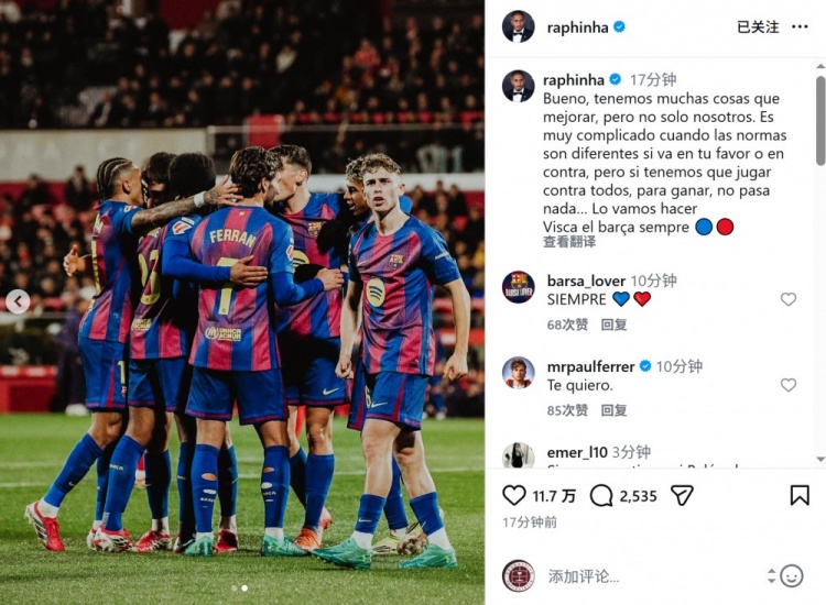 2月17日讯 西甲第24轮比赛,巴萨客场1-2不敌赫罗纳,巴萨边锋拉菲尼亚更新社媒动态,表达对判罚的不满。