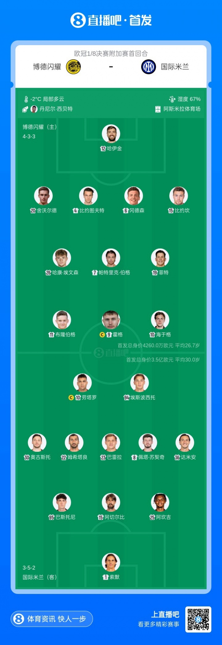2月19日讯 北京时间2月19日凌晨04:00欧冠1/8决赛附加赛首回合,国米做客挑战博德闪耀,目前双方公布了本场比赛的首发阵容。