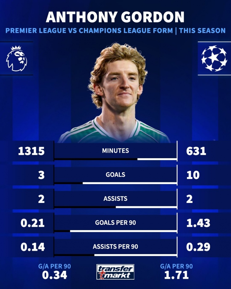 2月19日讯 欧冠附加赛首回合比赛,戈登打进4球,纽卡客场6-1击败卡拉巴赫。德国转会市场统计了戈登本赛季英超、欧冠数据,并做出对比。