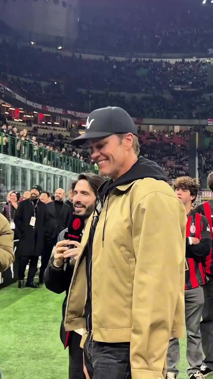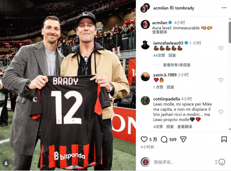NFL传奇四分卫布雷迪来到圣西罗球场,现场观看这场比赛,他与伊布合影,并获赠印有自己名字的米兰球衣。