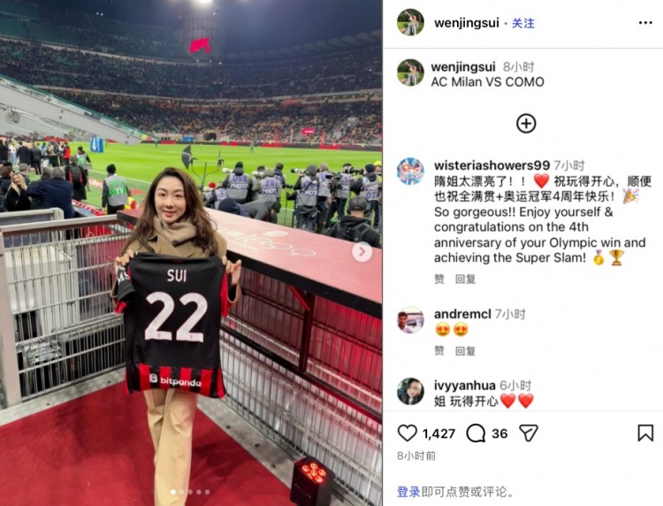 花滑名将隋文静社媒晒照,现场观战米兰vs科莫并手持米兰22号球衣