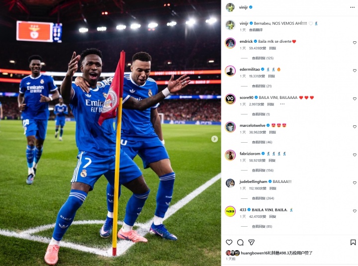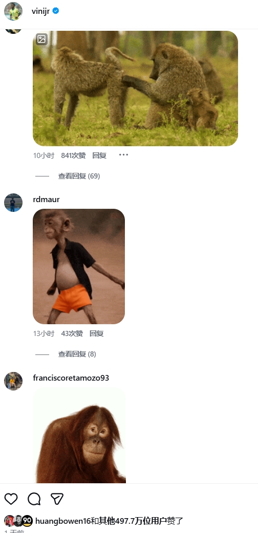 虽然不乏队友以及球迷的支持评论,但是评论区还是被球迷不和谐的评论攻占。很多球迷在评论区晒出猩猩、猴子的表情包嘲讽维尼修斯。