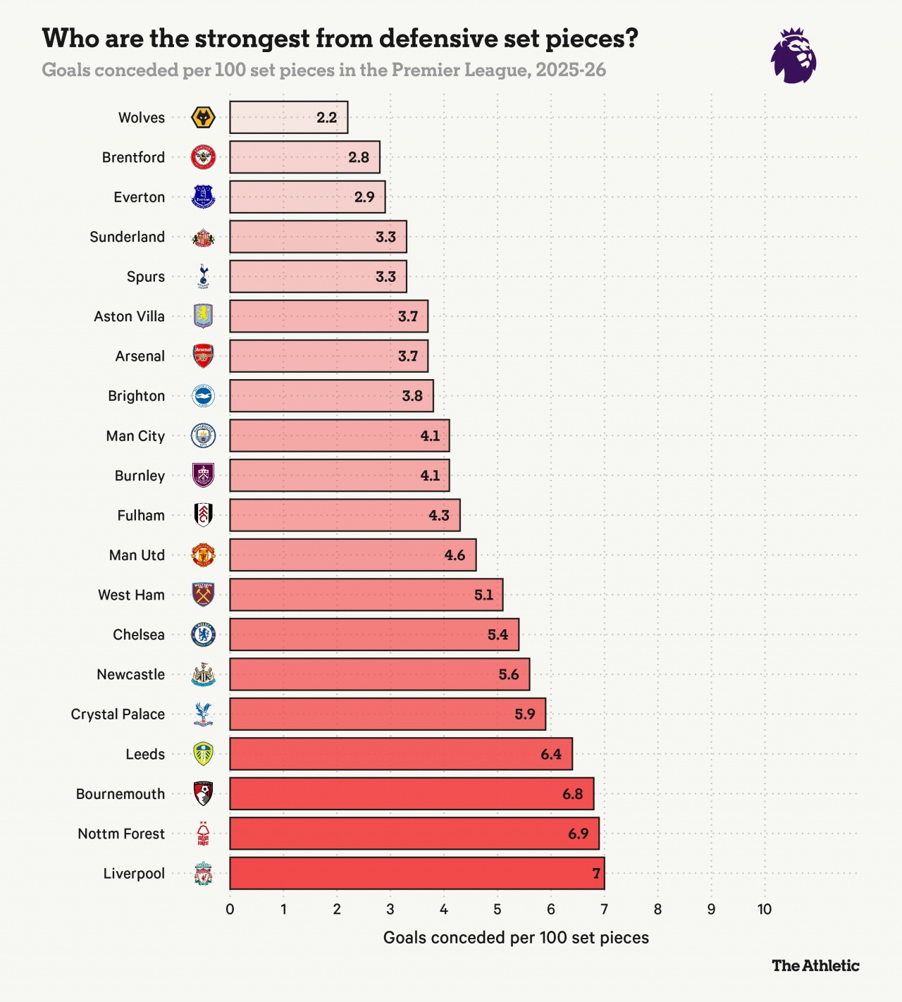 在每100次定位球防守中,垫底的狼队出人意料的排名榜首,他们每100次定位球防守仅丢2.2球,布伦特福德2.8球第二,利物浦7球排名最末。