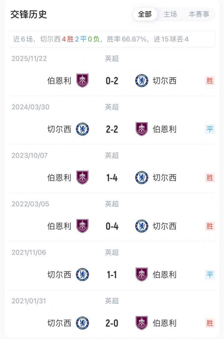 目前,切尔西12胜8平6负积44分位列英超第5;伯恩利4胜6平16负积18分位列倒数第二。切尔西近5轮英超4胜1平保持不败。