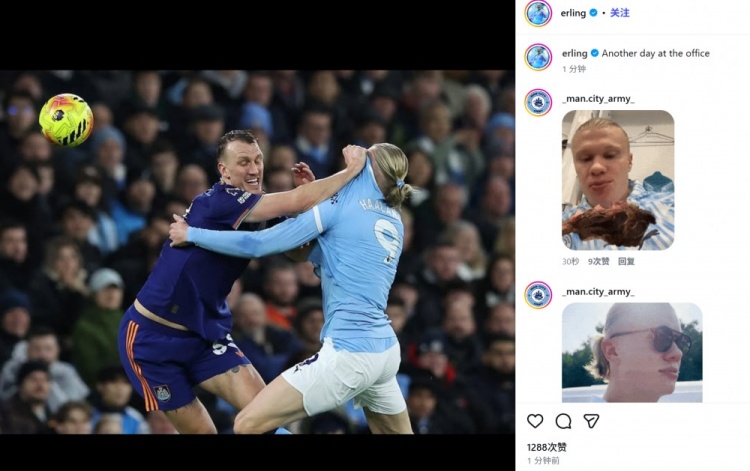 哈兰德也在赛后通过社媒晒出自己和丹·伯恩互相拉扯的贴身肉搏照,并幽默调侃:“办公室里的又一天。”