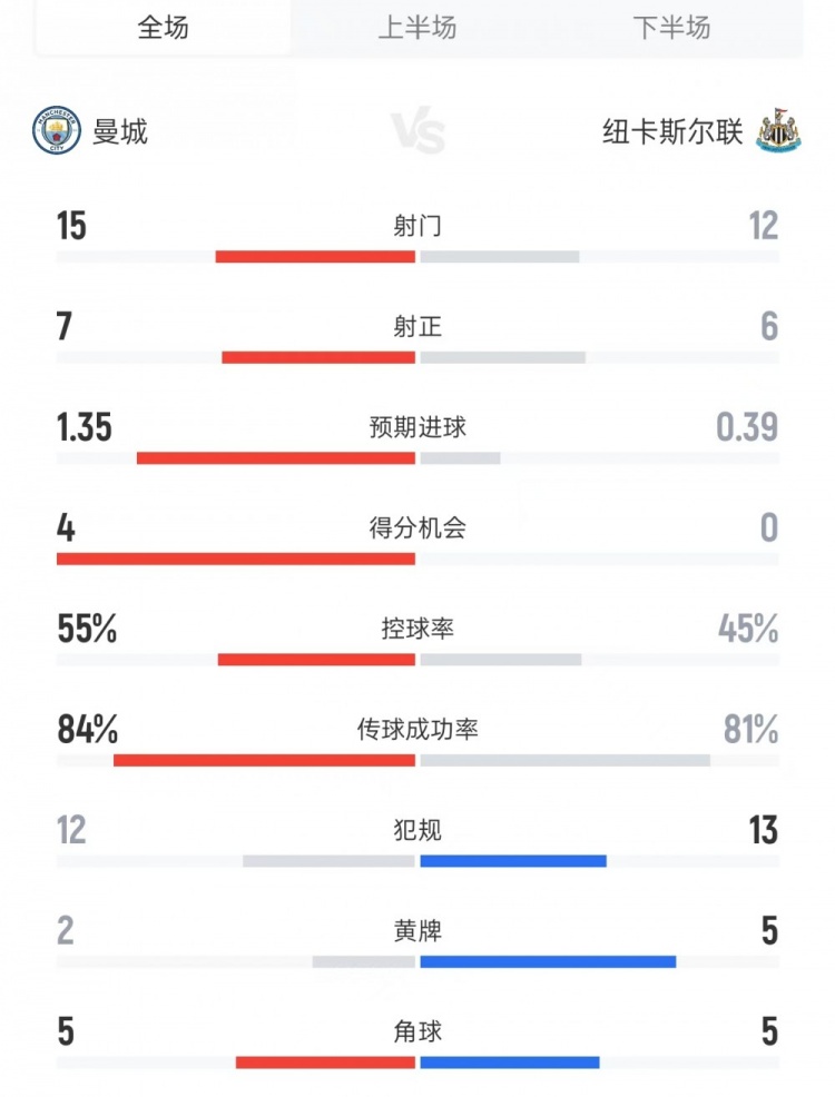 曼城vs纽卡数据:射门15比12、进球机会4比0、控球率55%比45%