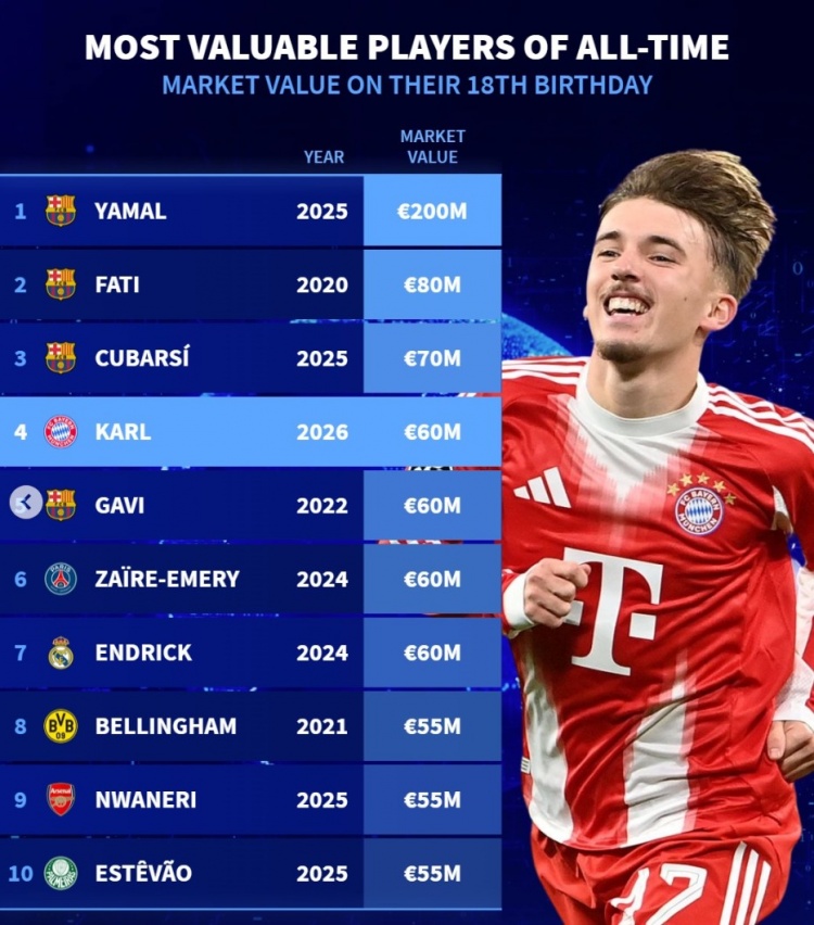 2月22日讯 拜仁小将卡尔今日迎来18岁生日,数据统计显示他也是历史同龄德转身价并列第四贵的球员。