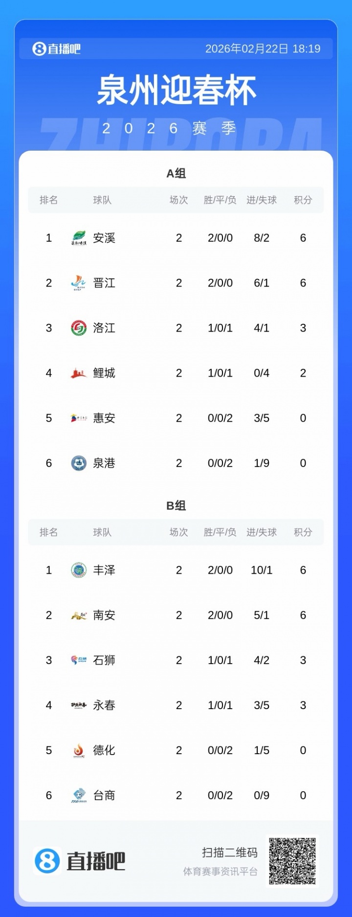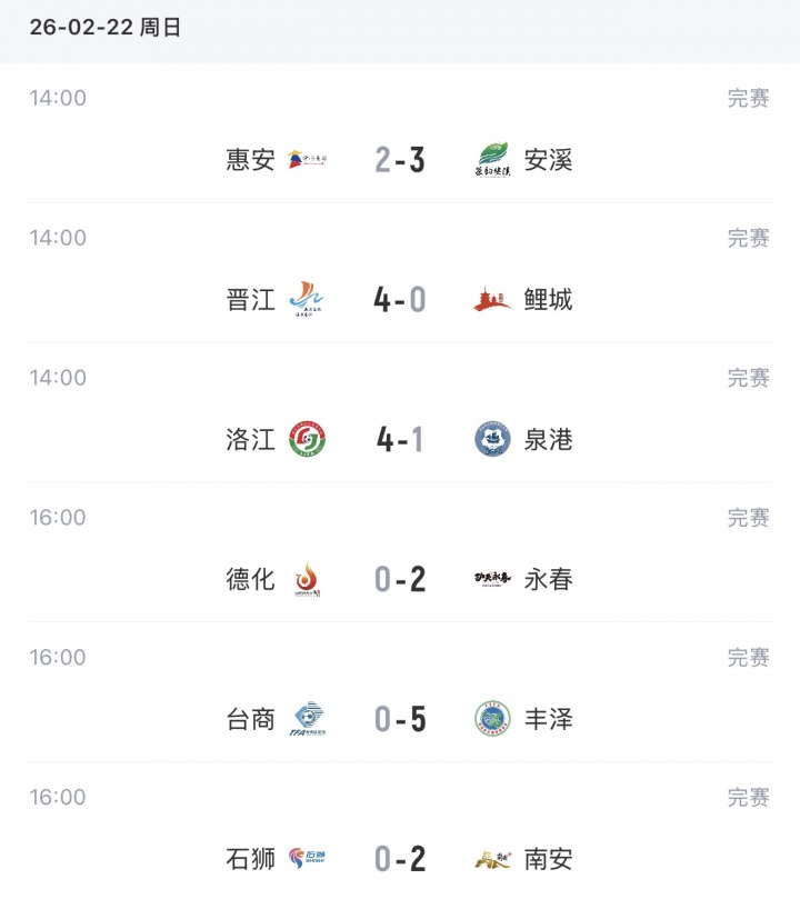 02月22日讯 泉州市首届“迎春杯”足球联赛今天结束6场比赛的争夺,晋江、洛江、丰泽大胜对手,安溪、永春和南安取胜,本文为大家带来每场比赛的进球动图和积分榜情况。