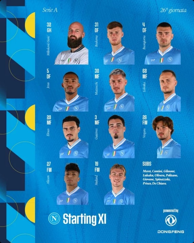 那不勒斯首发:32-瓦尼亚、31-别克马、5、胡安、4-布翁乔尔诺、30-马佐基、3-米格尔·古铁雷斯、20-埃尔马斯、68-洛博特卡、27-阿利森、26-维尔加拉、19-霍伊伦