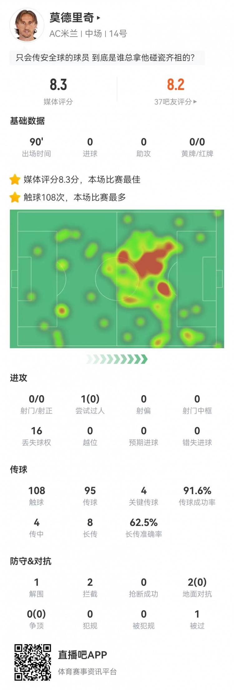 莫德里奇本场16丢失球权+4关键传球+5成功长传 8.3分全场最高