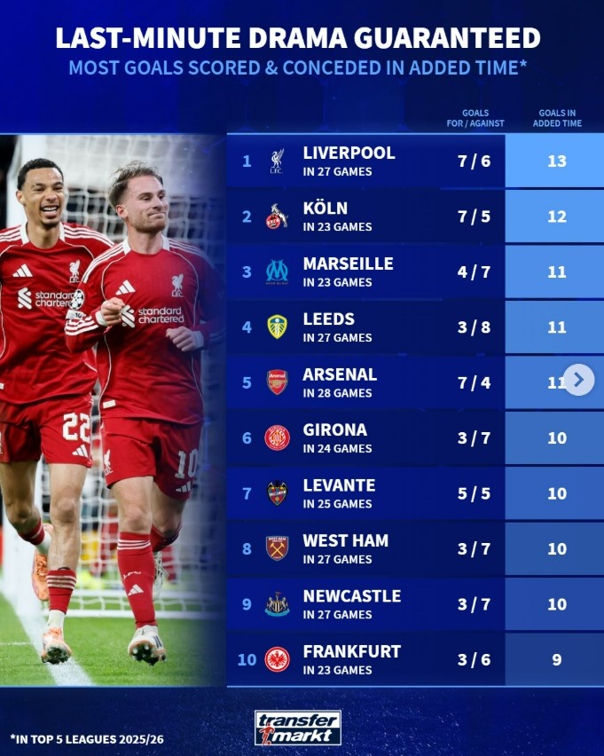 本赛季五大联赛补时进球+失球最多球队榜:利物浦进7球丢6球居首