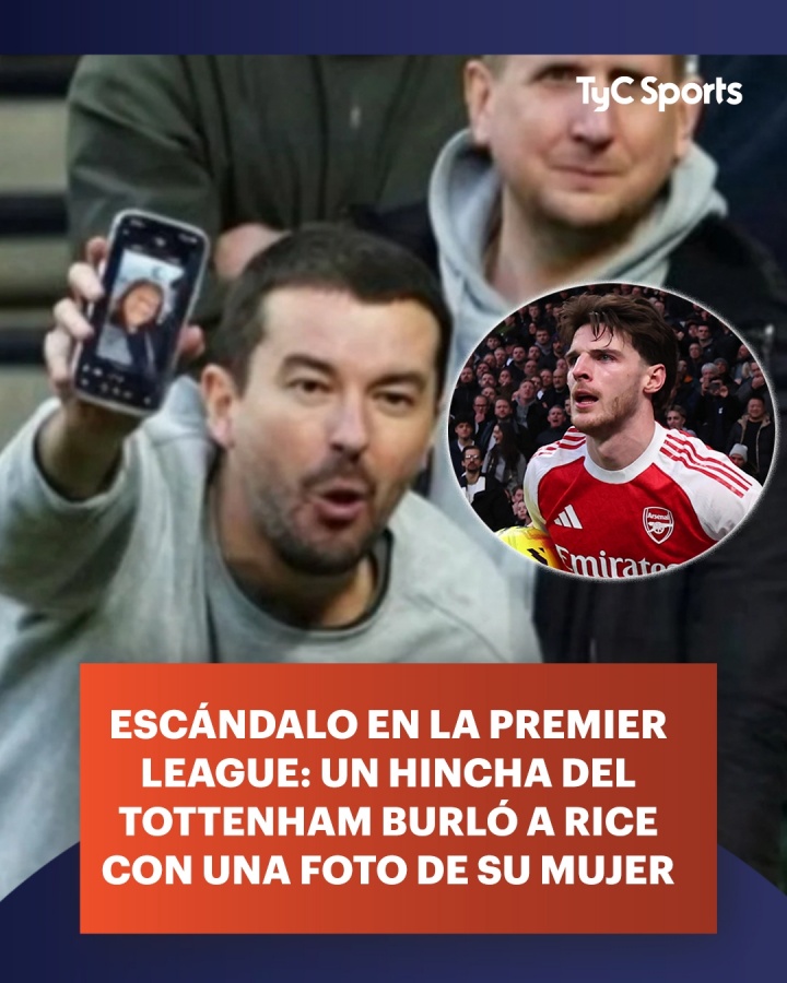报道称,在Shutterstock拍摄的一张照片中,在热刺主场的主队看台上,有一个人的手机屏幕上显示着赖斯妻子弗莱尔的照片,这位球迷朝着身前的赖斯挥舞手机,试图挑衅他。