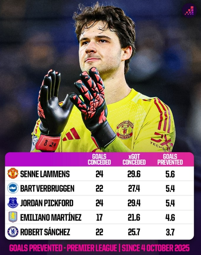 拉门斯(曼联)丢24球,预期失球29.6球,阻止5.6球